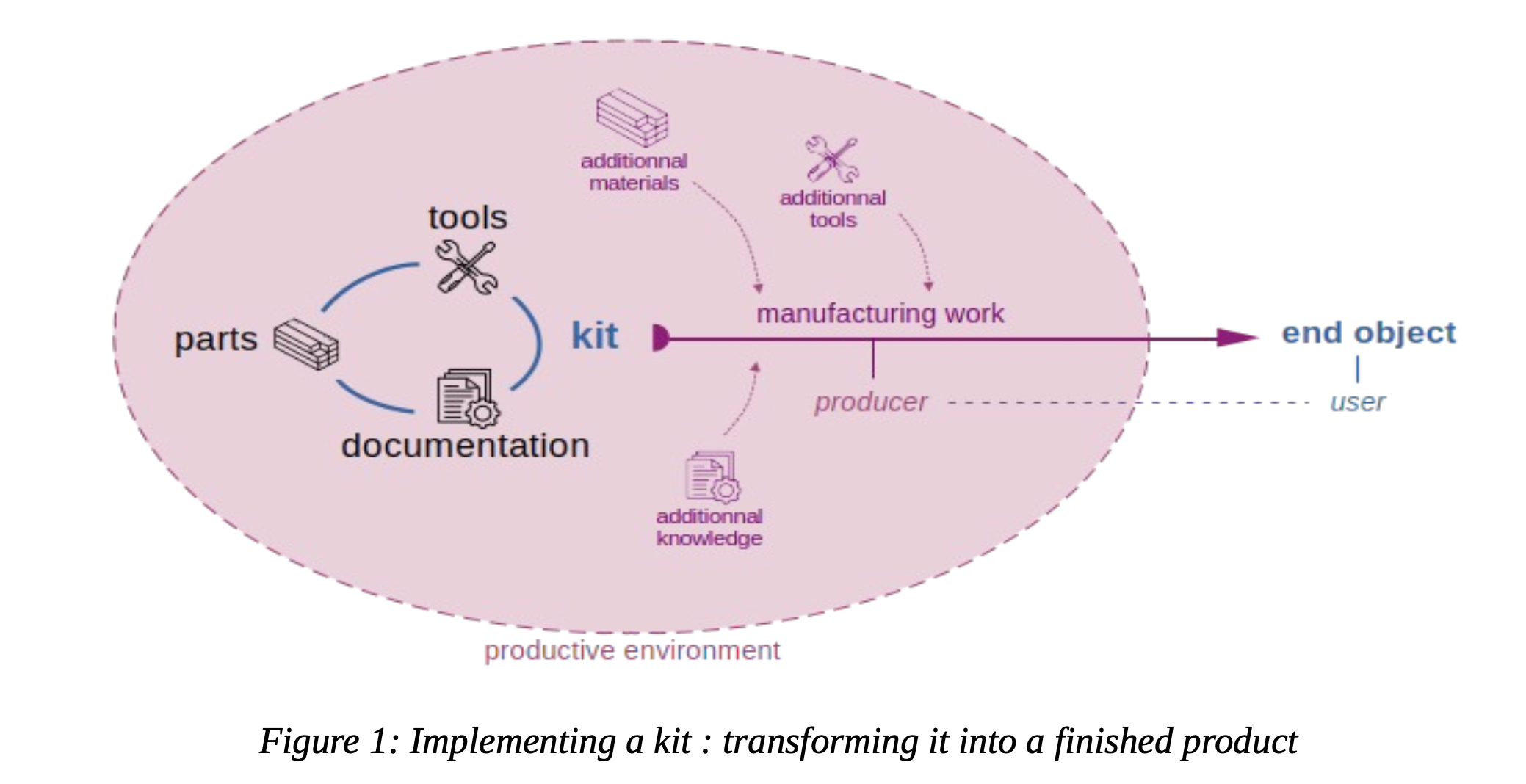 In this diagram, the first ideas on the Kit are illustrated: a kit always consists of parts, tools, and documentation. The role of using kits as a learning instrument, or as a kind of action product. The producer and user merge in a “prod-user,” more than a prosumer, producer, and consumer, which is more passive. As referred to: “it brings us back to the classic STS issues of the joint development of objects and their technical and social environments (Akrich 1989).”